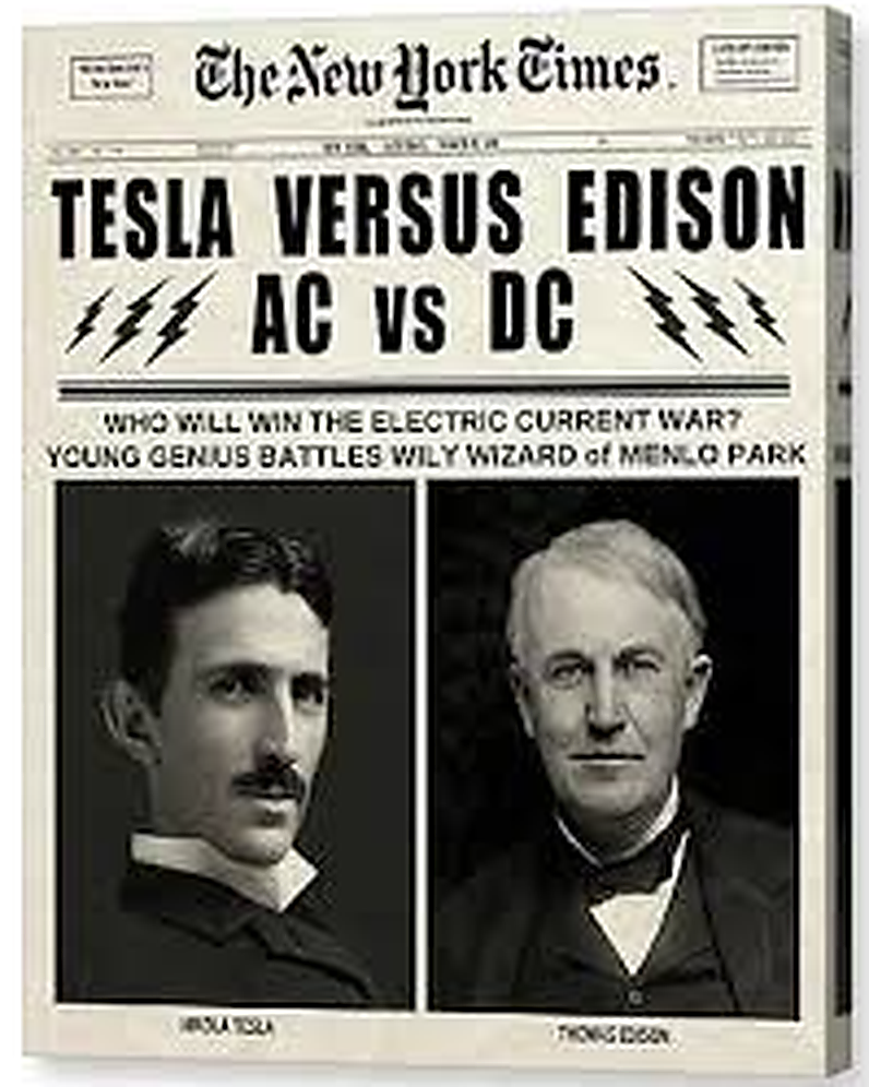 A New York Times article from the early 1900s highlighting the famous rivalry between Nikola Tesla and Thomas Edison — a battle over AC vs DC power that still shapes our electricity bills today.”